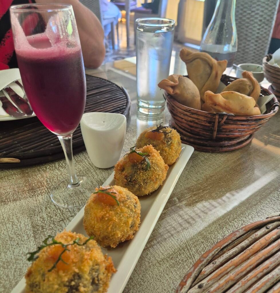 As bolinhas de prieta com gorgonzola — a tradicional linguiça negra chilena — tinham sabor intenso e textura macia por dentro, com aquele toque marcante que combina lindamente com vinho tinto. A empanada de charque veio dourada, recheio bem temperado, trazendo aquele lado mais autêntico da cozinha chilena. Duas entradas simples na aparência, mas cheias de personalidade no paladar.